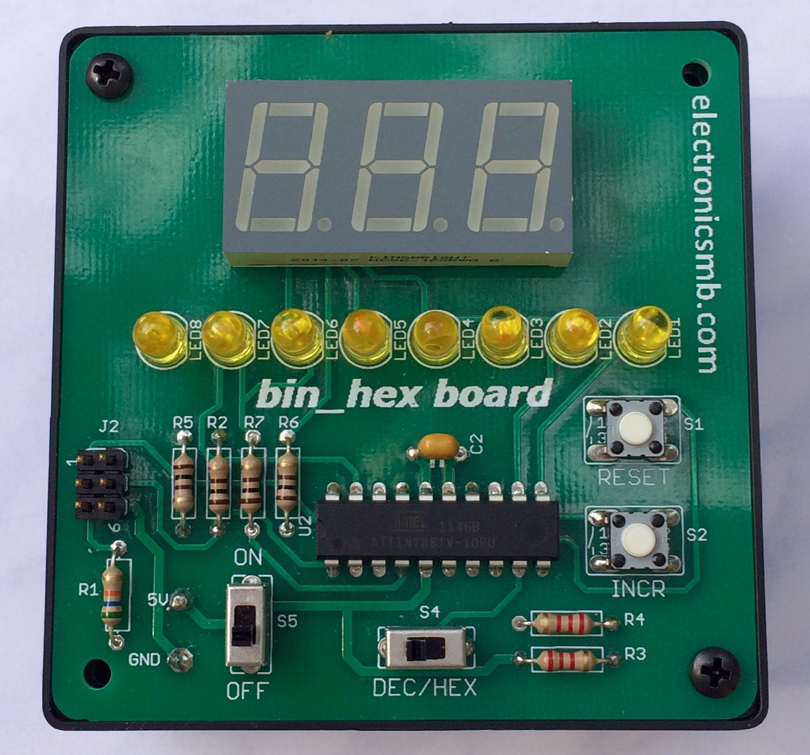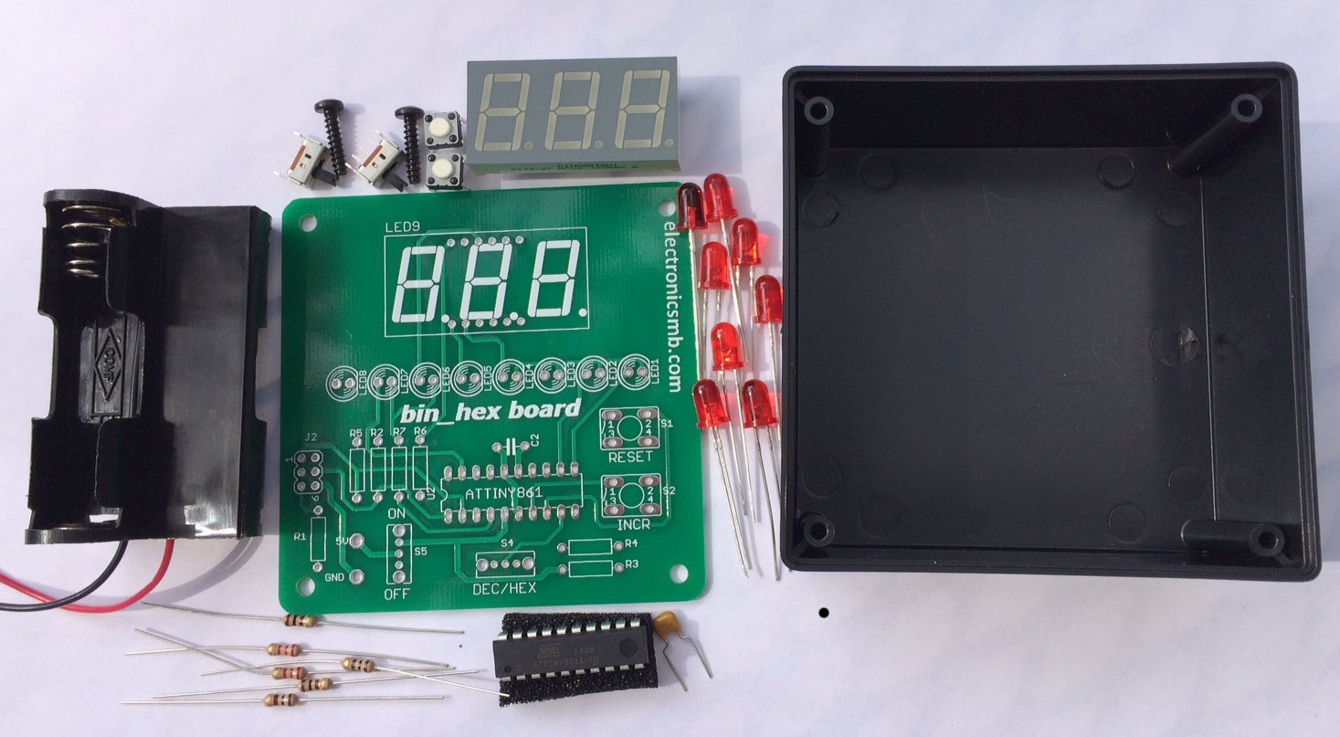 The bin_hex kit is useful for teaching binary, decimal and hexadecimal number systems. It was redesigned in Jan. 2014, and again in 2015 to reduce cost. It has the advantage of being a hands-on tool that helps add some energy to the teaching of an otherwise difficult and boring subject (not to me!).